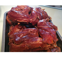 明明熏雞:傳統工藝(鐵鍋熬煮4-5小時),色澤紅潤,肉質酥嫩。